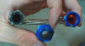 For flow, we only care about the ID. With the -6 measurements listed for the "Perform-O-Flex" hose above, we can see that the smallest diameter is at the hose ends (swivel seal tube hose end) and is only ~.226". The stock 5/16" OD fuel supply line measures more than this at it's minimum dimension of ~.245" ID at the flared ends & ~.256" ID elsewhere. That is one reason I favor a -8 fuel feed hose over a -6. The smallest dimension on a -8 hose (at the swivel seal tube hose ends) came in at .375". Using the minimum measurements, the -8 hose will flow well over twice as much as the stock line whereas the -6 is worse than stock. When time permits I will actually calculate pressure drop between the stock supply line of known length and compare it to comparable -6 and -8 hoses. For a listing of available hoses, hose ends, and fittings/adapters, check out AN plumbing.com.