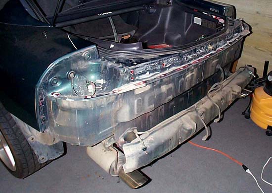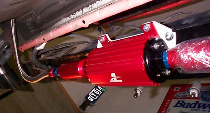After the stock hardware was removed, I began installing the fuel system starting with mounting the pump. AAM suggests placing the pump on the bottom side of the rear bumper. The lower it is placed, the easier it will receive fuel from the tank. If mounted higher than the tank, the pump life will be decreased unless you feed it with a second pump (preferably an in-tank unit). AAM claimed the fascia would not have to be removed, but it would have been difficult if not impossible to have a clean install without doing so. BTW, I did clean it up before putting it all back together.